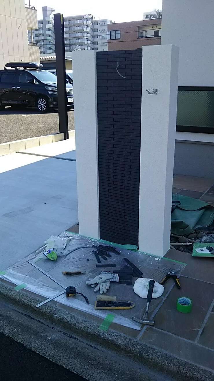 もうすぐで門柱が完成します。上品でシックなデザインを意識しており、落ち着いた色合いです。