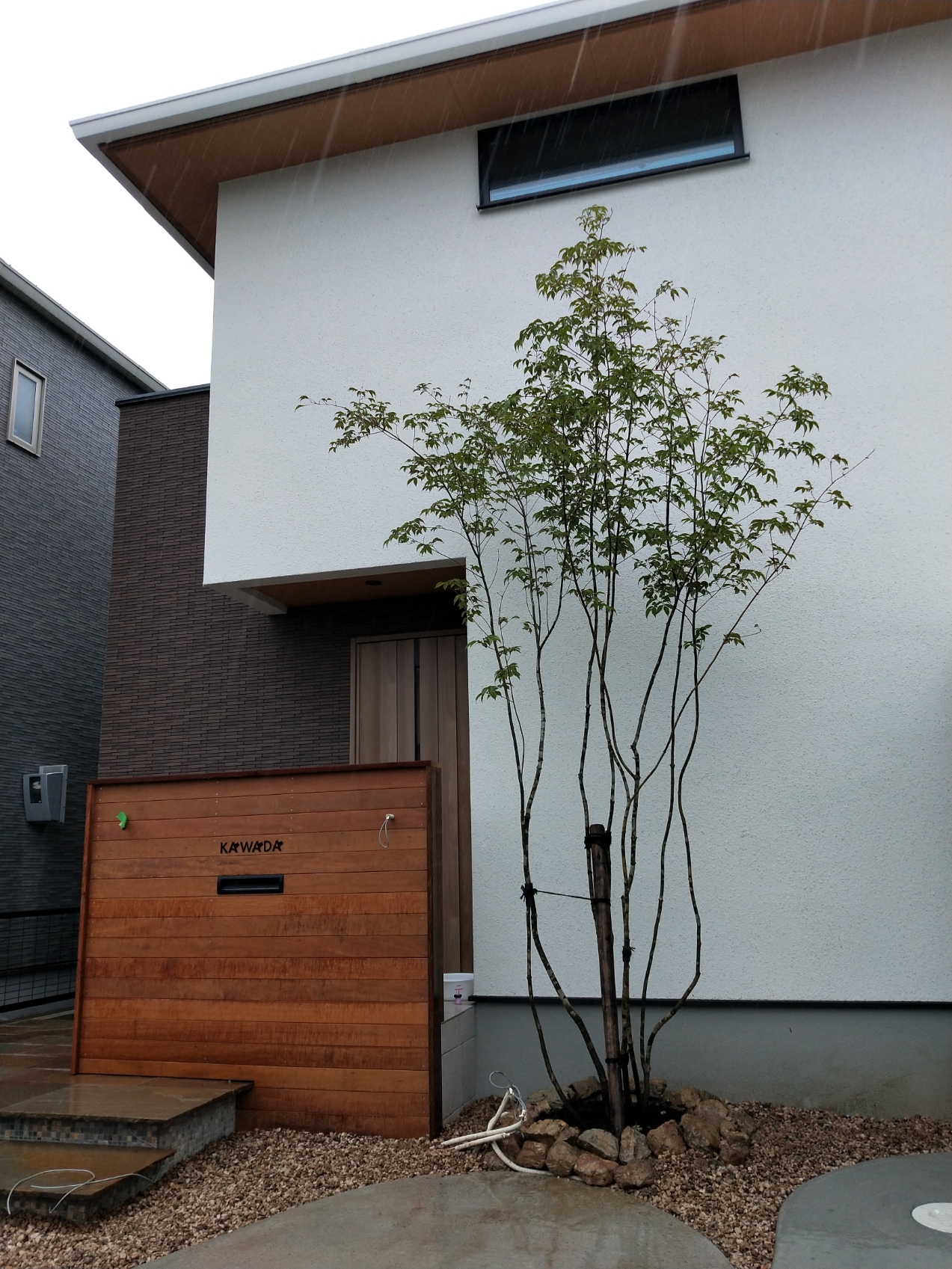 天然木の門柱にもマッチしたシンボルツリーです。