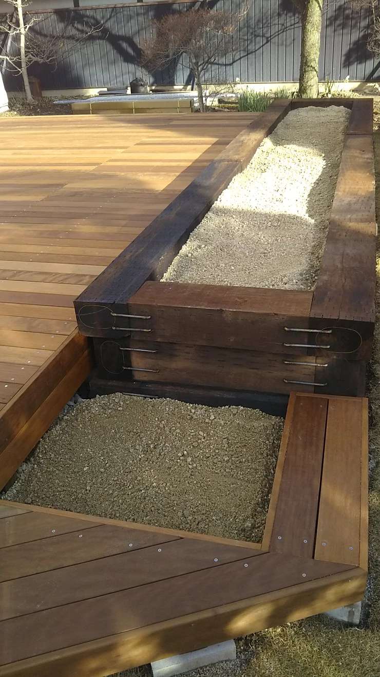 安定性にしっかりと気を配りつつ、花壇を組み合わせたウッドデッキを施工しています。