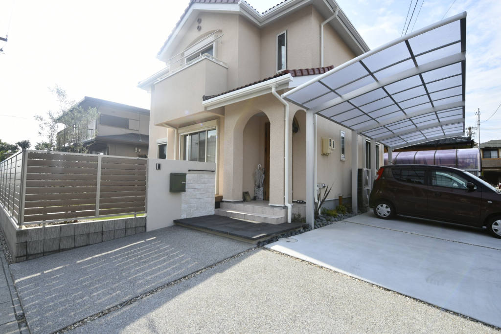 次にご紹介するのは、愛知県一宮市で手掛けた、柔らかい雰囲気と機能性を両立させた新築外構の施工事例です。家族を温かく迎え入れるような、優しい色合いのデザインテイストでまとめています。
