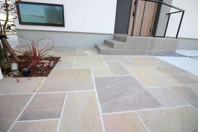 アプローチの自然石はランダムに敷き詰め、単調さを回避。