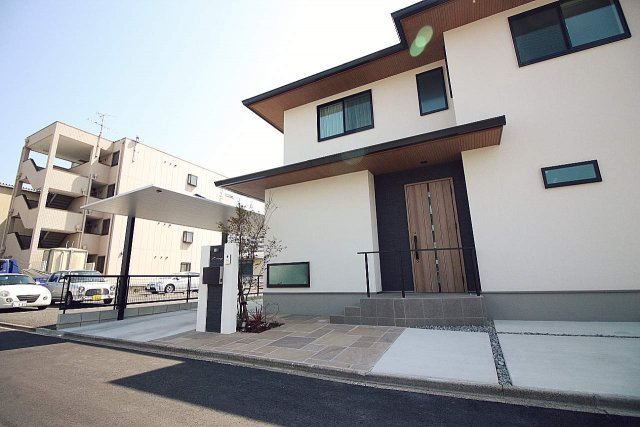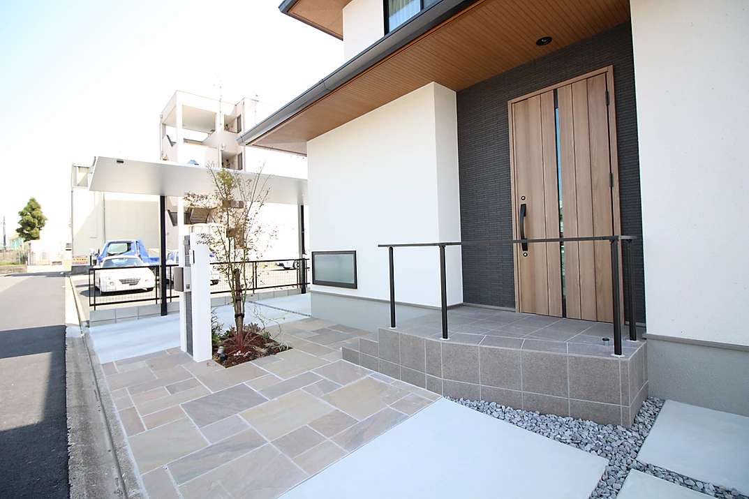 天然石のアプローチとカーポートが特徴なモダンなタイプの新築外構現場です。