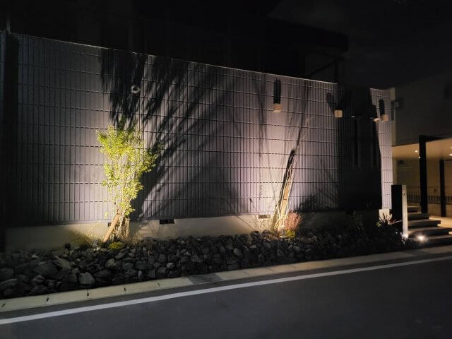 階段上にガラスフェンスを設置し、転落防止も兼用。ライトアップの反射もしてくれています。