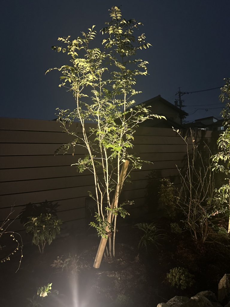足元には下草と照明を効果的に設け、夜には植栽がやわらかく浮かび上がる幻想的な空間に。