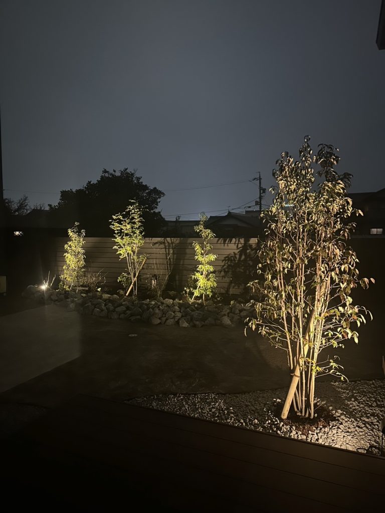 外部からの視線を程よく遮りつつ、内からは眺めを楽しめる、昼と夜で表情を変える心地よい庭に仕上がりました。