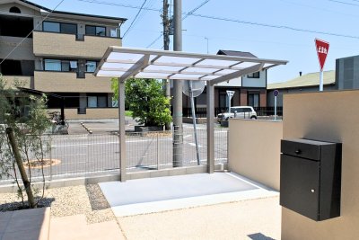 カーポートやサイクルポートなどのアルミ製品は、シャイングレー系で統一して主張を抑えます。