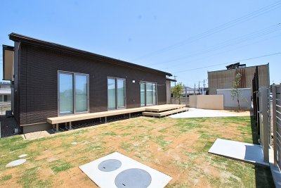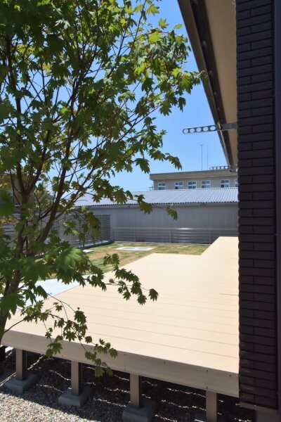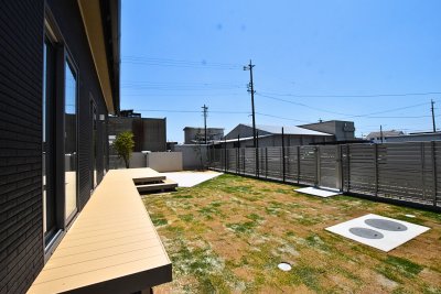 広々としたお庭には、ウッドデッキとタープ用のポールを設置し、アウトドアライフを楽しめるお庭に。