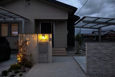 お洒落な表札や照明がワンポイントとなり、アプローチの洗い出し仕上げが、自然な質感をプラスしています。