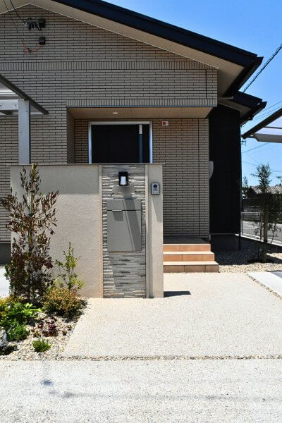 門柱にはインテリアに使用したアクセントタイルと似たデザイン素材を採用し、ベージュの塗り壁と組み合わせて、明るく優しい雰囲気に仕上げました。