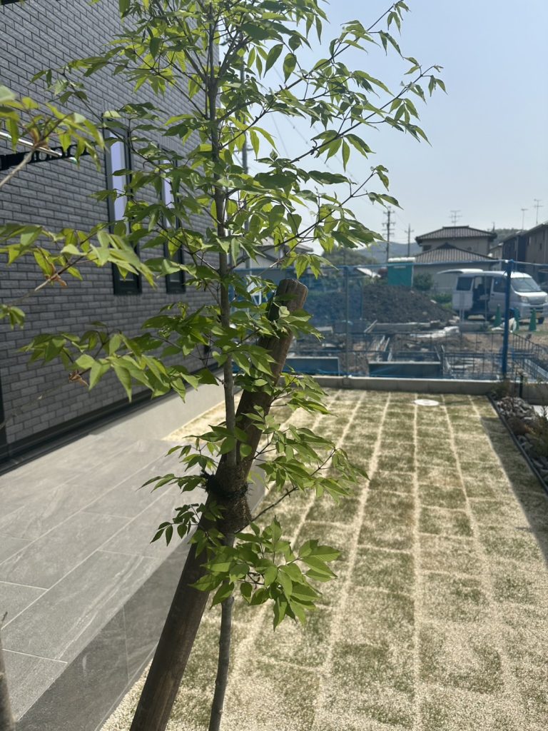 植栽にはトレンドのアオダモを中心に、ティーツリーやブラシノキといった