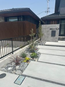 グレーとブラックを基調とした直線的なデザインに、割栗石と植栽を組み合わせることで、