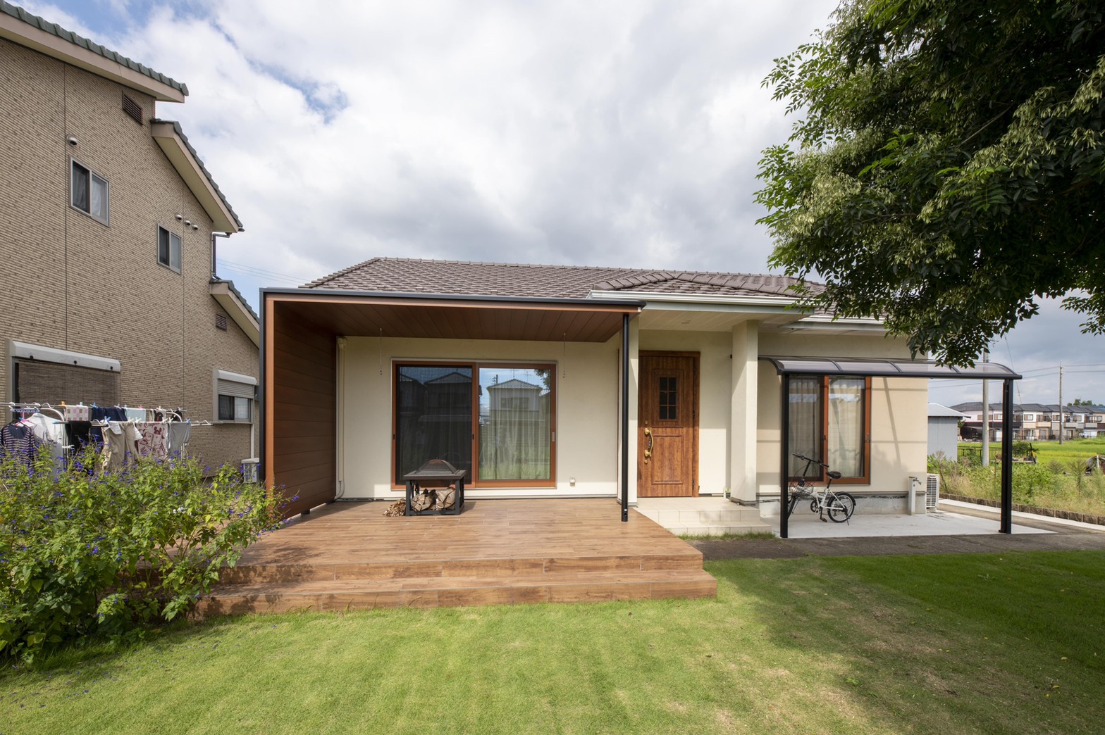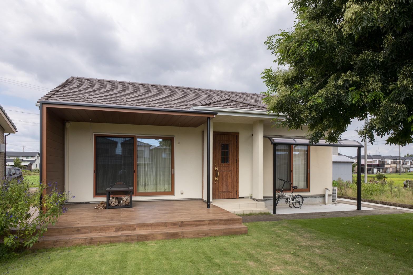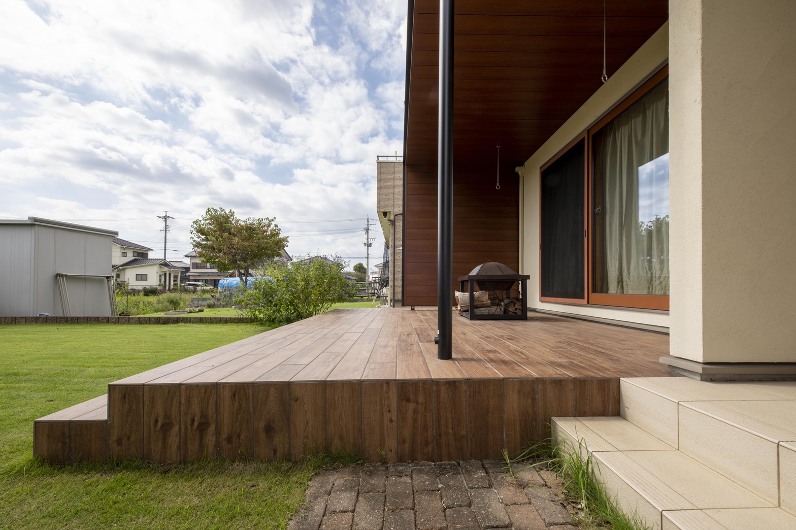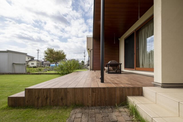 庭のシンボルにもなるよう大型の木目テラス屋根を設置し、タイルテラスには木目のタイルを使用しています。