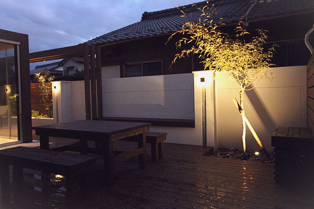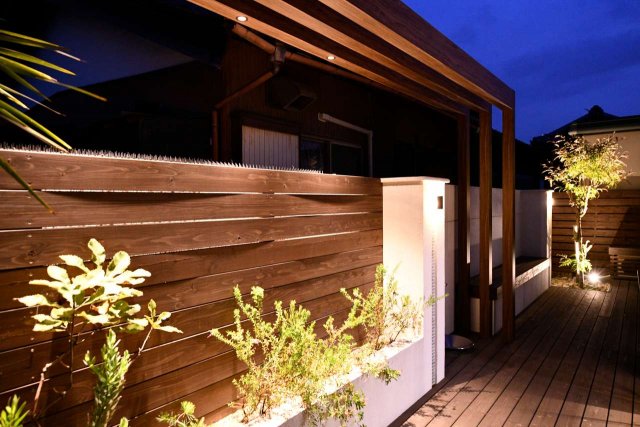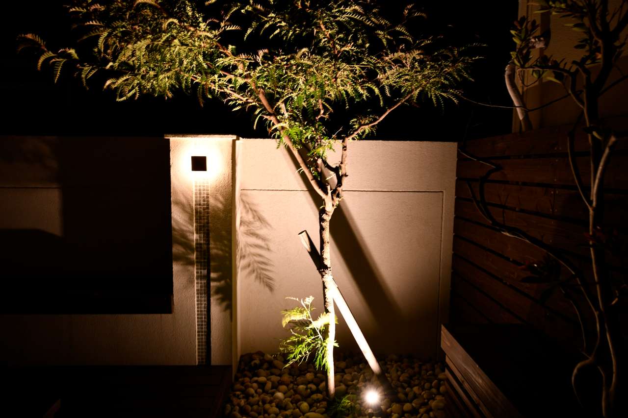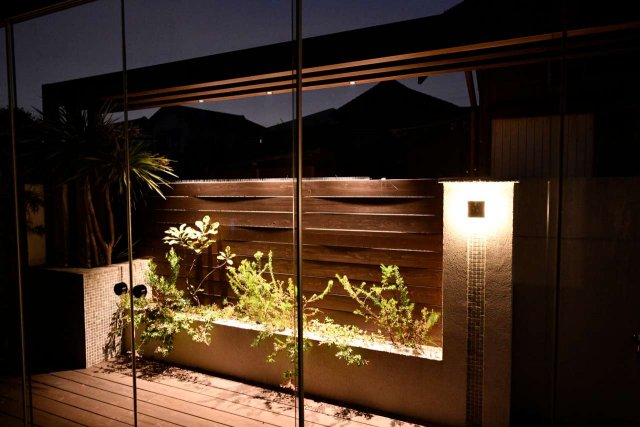 花壇をライトアップするために、フレームを飛ばして立体感を出しつつダウンライトを埋め込みました。