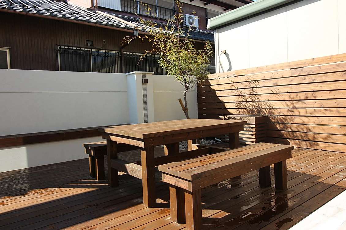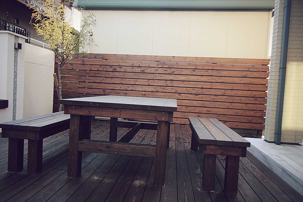 休日にはお庭にて過ごせるように造作ベンチの他に、天然木のオリジナルファニチャーも造作しました。