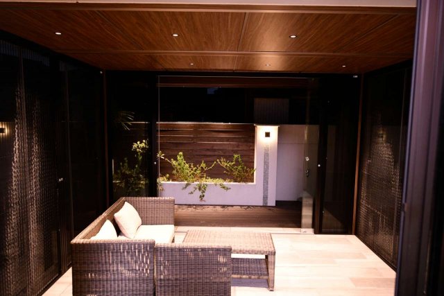 広い空間には屋外用家具が設置されており、雨などにも強い特殊な材質。