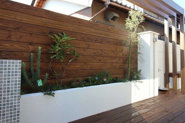 スリムな空間を活用する必要があったため、壁沿いの花壇をうまく利用しています。