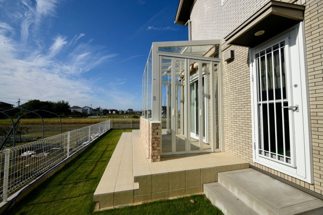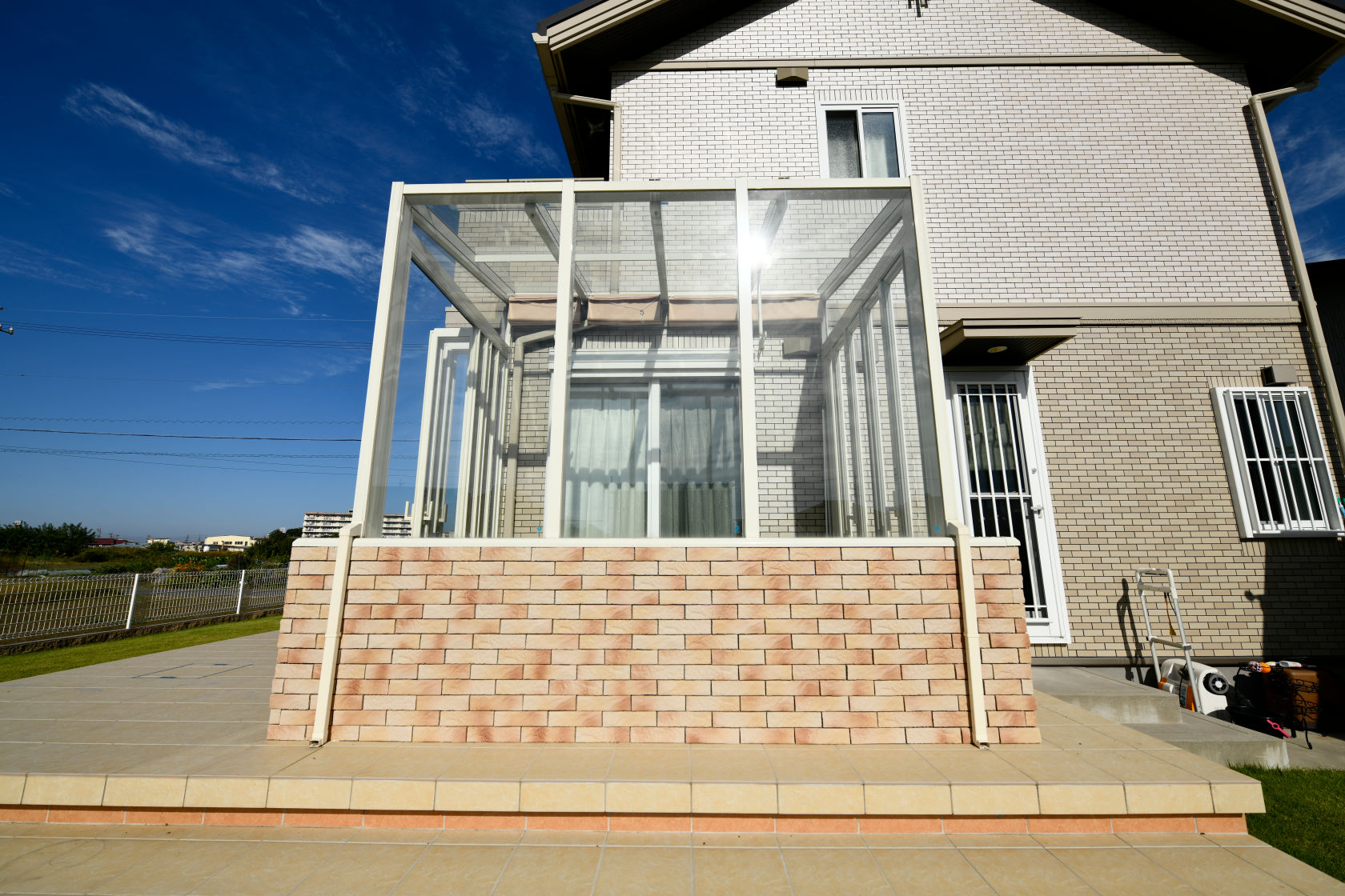 今回は予算の都合でガーデンルームはLIXILのココマを採用し、腰壁にタイルを張りました。